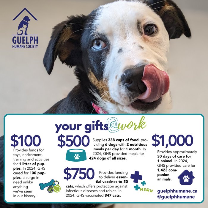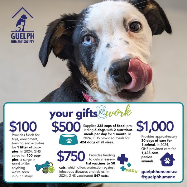 Because of you, second chances happen every day. The Guelph Humane Society makes it possible for over 3,000 lost, abandoned, and injured animals that come through our doors every year the chance to heal, recover, and find loving homes. All donations over $20 will be receipted with information provided.